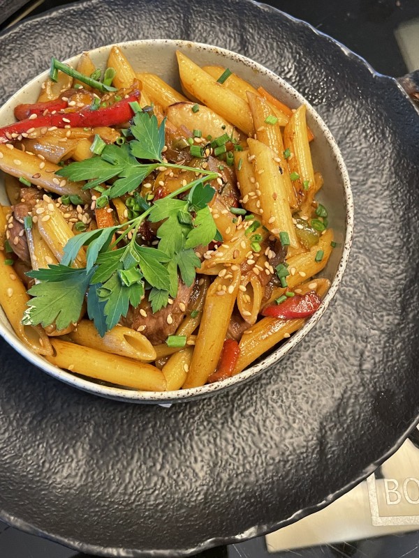 Un émincé de magret de canard accompagné de pâtes fraîches