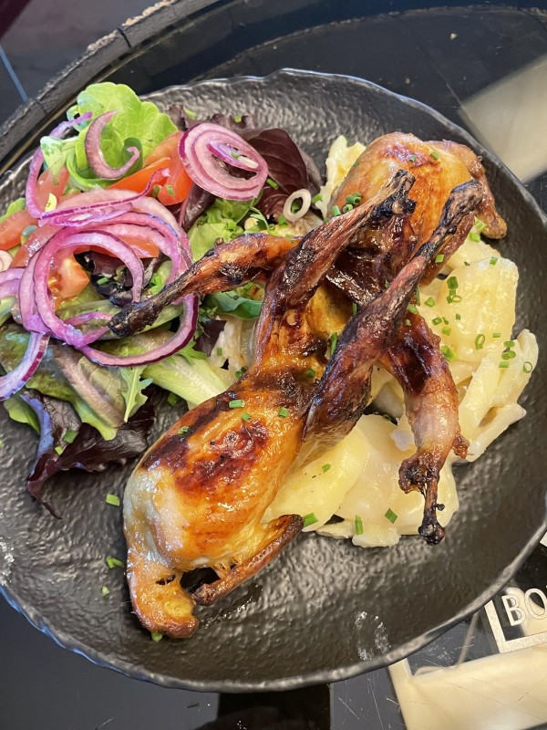 Cailles grillées accompagnées d un gratin dauphinois et salade verte .